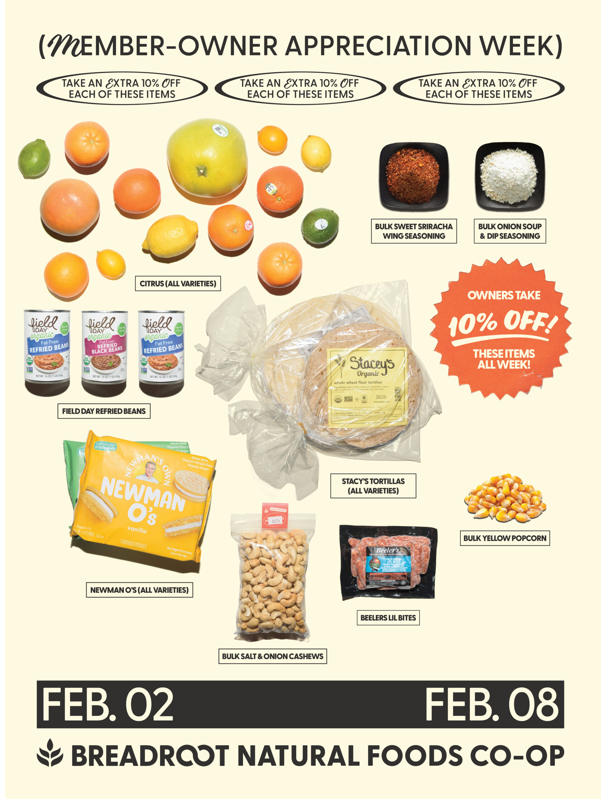 It’s the first Member-Owner Appreciation Week of 2026! From February 2nd through February 8th, we’re celebrating you at the Co-op! Enjoy owner-exclusive giveaways, in-store deals (your Hail Mary for The Big Game), and local Dimock Cheese samples on Saturday, February 7th from 11am to 2pm! Don’t get sacked by boring snacks, build a winning game-day spread with your Co-op favorites.